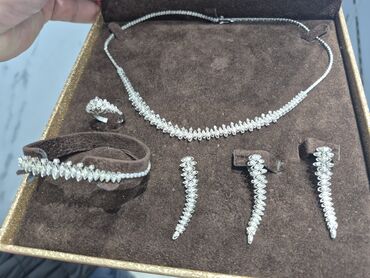 Zərgərlik dəsti – gümüş rəngli zirkon daşlı Tərkibi: - Boyunbağı: incə zəncir üzərində damla formalı asma. Asmada çoxsaylı xırda parlaq daşlar və açıq işləmalı dizayn. - Sırğalar: eyni damla forma...