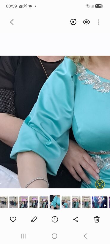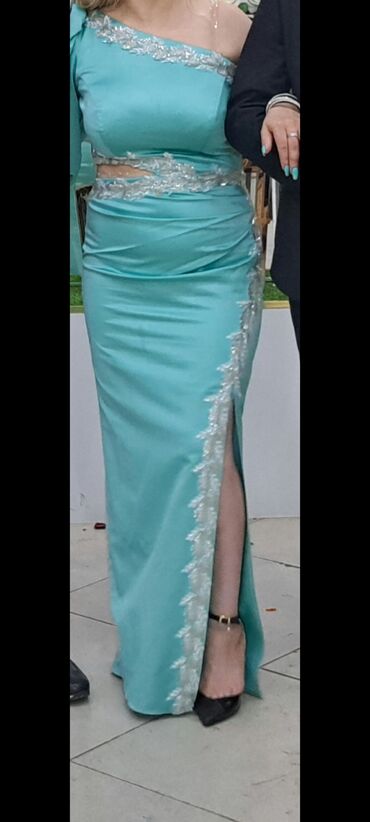 Zərif zümrüd-mavi rəngdə ziyafət libası