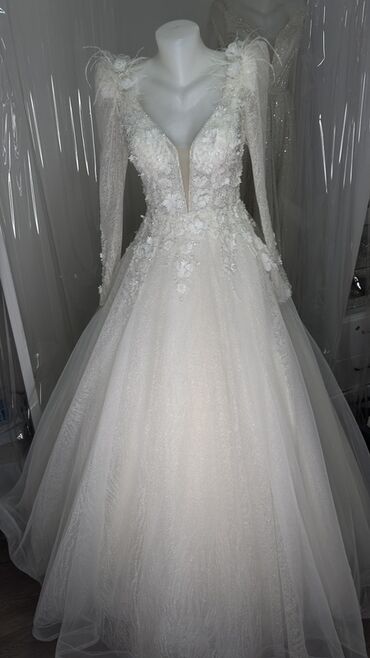 Gəlinlik – bal ziyafəti (A-line) silueti, uzun ətəkli, tül qatlı və parıltılı tekstura.