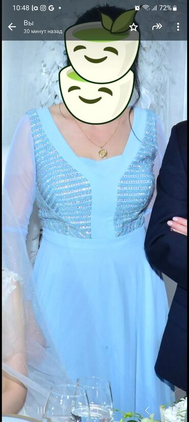 Açıq Göy rəngli zərif ziyafət/gecə donu. 300 azna Elatusda tikilib, 1 dəfə geyinilib. - Model: Uzun, A-kəsim ətəkli, dairəvi yaxalı - Material: Şifon və tül əsaslı, üstü bütövlükdə atlas effektli ...