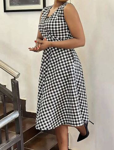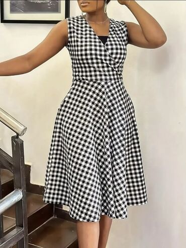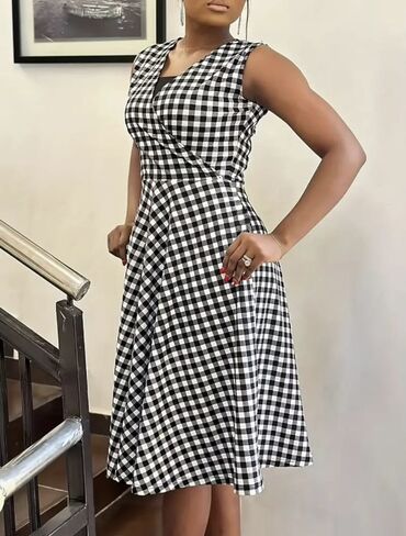 Ağ-qara dama-dama naxışlı, V yaxalı qadın donu. Qolsuz dizaynı və geniş ətəyi ilə rahat və zərif görünüş təqdim edir. Bel hissəsi bədənə oturan kəsimə malikdir. Müxtəlif tədbirlər və gündəlik istifadə üçün uyğundur. Yenidir