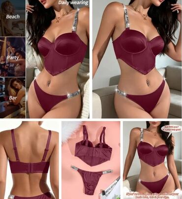 - Dizayn: Straplı bantau bralet və nazik kəsimli bikini altı. Bəzi modellərdə ön hissədə qarmaqla bağlanma, digərlərində arxa qapaqlı kilid; büstqalter variantlarından biri kupalı, korse görünümlü və tənzimlənən çiyin qayışlıdır.