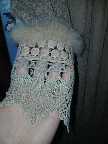 - Qol: Uzun, şəffaf krujeva; manjetdə incə naxışlı gipür və yumşaq tük haşiyə