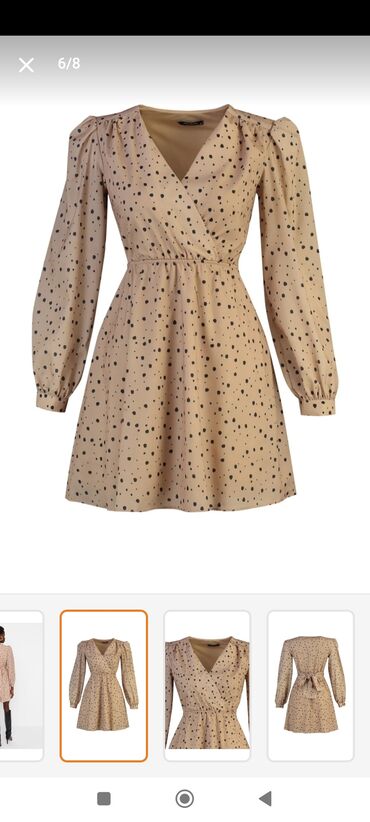 Qadın paltarı – qara fon üzərində ağ xallı dizayn - Model: V-yaxa, qısaqollu - Kəsim: Öndən kəsişən (wrap stilinə bənzər) forma, bel hissəsində bağlama kəməri - Uzunluq: Midi - Parça: Yüngül, axıc...