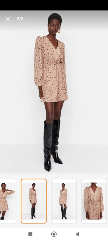 Zərif bej rəngli qadın paltarı - Dizayn: V-yaxa, öndən qatlana bilən (wrap) görünüşlü üst hissə, beldə eyni parçadan geniş kəmər effekti, aşağı hissədə volanlı ətək. - Qol: Qısa və rahat kəsim. - ...