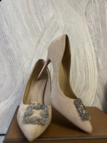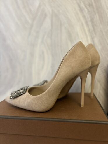 Zərli qadın tuflisi – parıldayan dekorlu, hündürdaban model - Rəng: açıq bej/şampan tonlarında - Üst hissə tam şəkildə iri-kiçik kristal daşlarla bəzədilib, işıqda güclü parıltı verir - Model: qap...