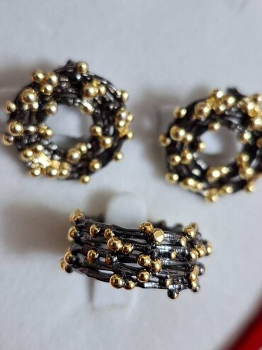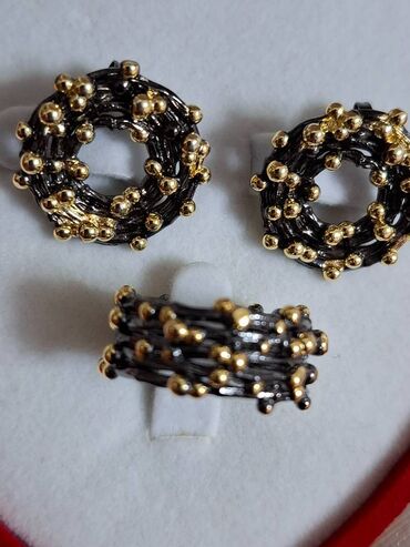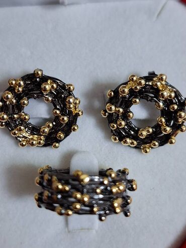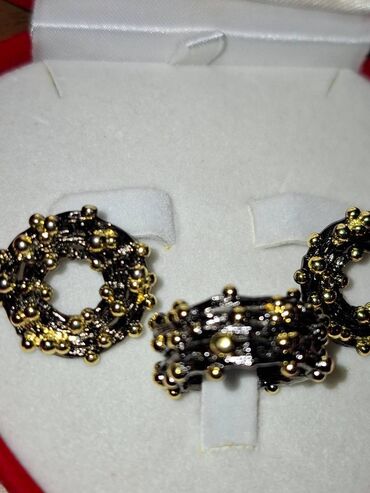Gümüş suyuna salınma dəst – SSRİ. Elmlər, 20 nömrəli məktəbin yanı. Təsvir: - Klassik oval formalı 3-lü dəst: sırğalar + üzük/aksesuar başlığı tipli element. - Çərçivə hissəsi gümüş suyuna salınmı...