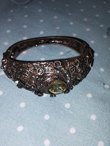 - Antik üslublu sərt qolbaq: tünd gümüş tonlarında, zəngin oyma naxışlı korpus, üzərində xırda dekorativ daşcıqlar və ön hissədə iri açıq-sarı rəngli fasetli daş. Qabariq barokko motivləri, dairəvi xətlər və muncuqvari haşiyələr vurğulanıb.