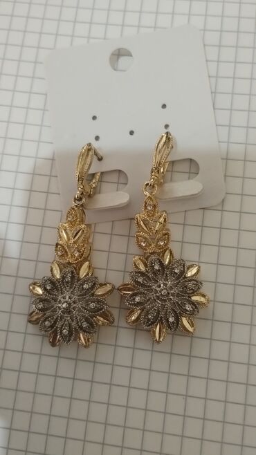 - Qızılı-gümüşü qarışıq rəngdə asqılı sırğalar: yuxarıda yarpaq motivli elementlər, aşağıda iri çiçək formalı rozet; səthdə xırda naxış və işıltılı detallarla zəngin işləmə. Qarmaq tipli qulplar kartda təqdim olunub.