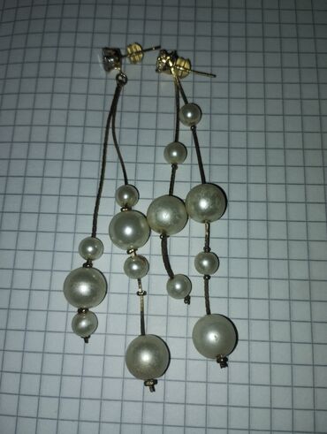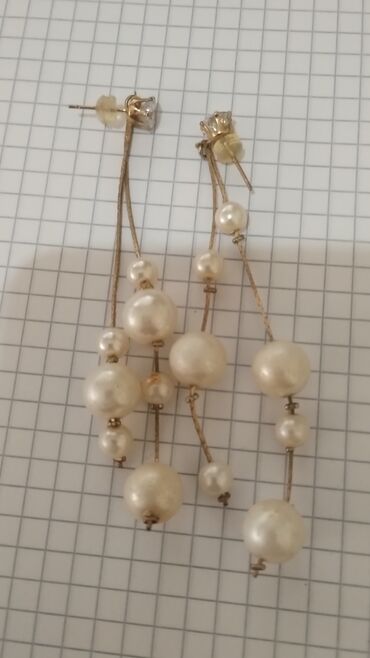 - Uzun mirvari effekti sırğalar (pərçimli sancaqla): iki nazik metal tellə düzülmüş müxtəlif ölçülü krem rəngli muncuqlar, asimmetrik, hərəkətli dizayn. Şəffaf silikon arxalıqlar daxildir.
