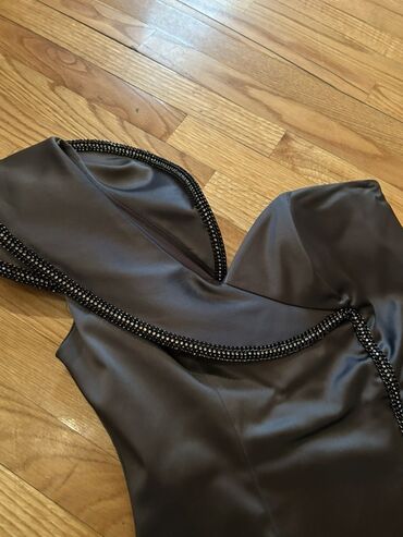 Tünd bej,gul qurusu rəngli elegant kokteyl/gecə geyimi.34/XS razmer - Asimmetrik birçiyinli dizayn: sağ tərəfdə incə ip, solda geniş bir çiyin kəsimi - Bədənə oturan siluet, dizə qədər uzunluq - Ö...