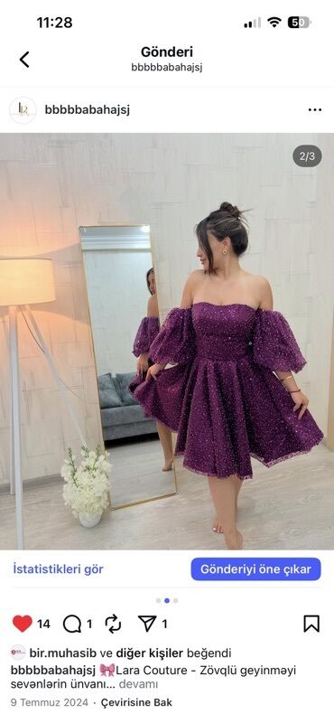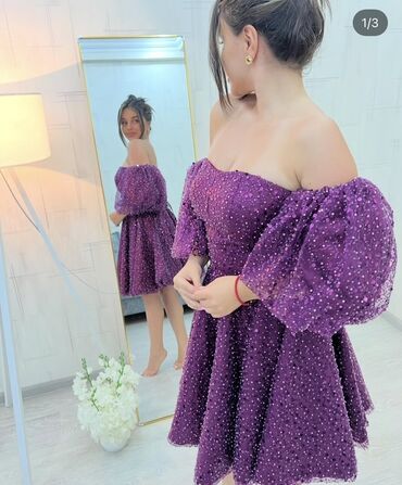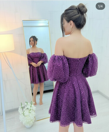 EndirimsizBənövşəyi rəngdə, qabarıq teksturalı, parıltılı dekorla işlənmiş qısa ziyafət/libas. Model bardot (çiyinüstü açıq) kəsimli olub, beldən ətəyə doğru həcmi artırılmış A-kəsimdir. Şişkin, üçdörddəbir uzunluqda puf qol detalı romantik görünüş yaradır. Quraşdırılmış büst hissə fiquru vurğulayır, qatlı ətək isə hərəkətdə gözəl düşür. Toy, nişan, məzuniyyət və xüsusi tədbirlər üçün ideal seçimdir. Rəng dərin bənövşəyi tonundadır, bütün səth boyu xırda payet və muncuq effektli işləmələr mövcuddur. Minimal aksessuarlarla asan kombinlənir, ayaqqabı və çanta seçiminə uyğun həm klassik, həm də modern obraz yaradır.