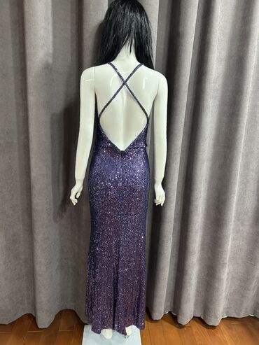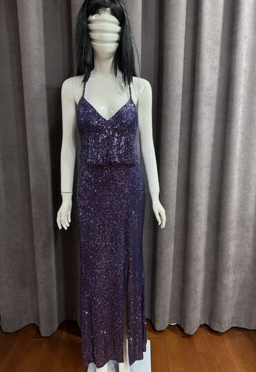Bənövşəyi rəngdə ziyafət geyimi cox az geyinilib - Model: Uzun, düz kəsim, arxa hissədə yarıqla - Yaxa: Geniş “V” formasında, çiyinlərə oturan parıltılı/payetli bəzəkli üst hissə - Material: Qalın...