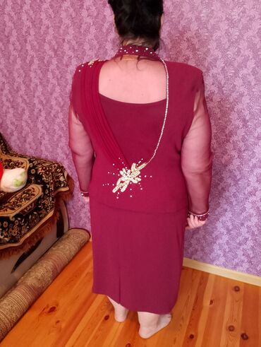 Qadın ziyafət dəsti – tünd bordo rəngdə - 3 hissəli dəst: qolsuz iç köynək, nazik şifon qol və ön örtülü jaket, ətək. - Rəng: tünd bordo (şarab). - Bəzək: qızılı və gümüşü daşlarla işləmə, ön hiss...