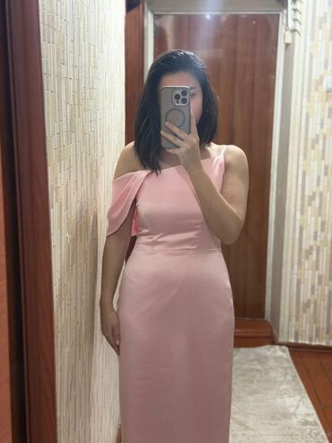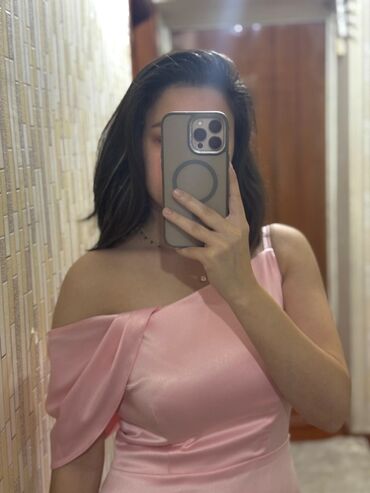 Zərif ziyafət/platyə – pudra-çəhrayı rəngdə, midi uzunluqda. - Asimmetrik üst hissə: bir çiyin açıq, digəri tül/hava kimi qatlanmış iri güllü bəzəklə. - Parıltılı bel kəməri: kristal daşlarla işlə...