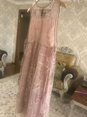 - Məhsul: Zərif ziyafət/libas - Rəng: Pudra/solğun çəhrayı - Siluet: Uzun, axıcı ətəkli - Üst hissə: Şəffaf tor üzərində parlaq muncuq və qaş işləmələri, rombvari bəzəkli yaxa - Materiallar: Tül qa...
