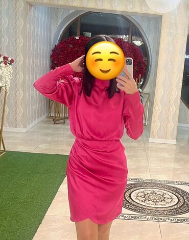 Qadın paltarı – parlaq fuksiya rəngi - Model: qısa, A-kəsim ətək - Parça: atlas/satene bənzər parıltılı material - Yaxa: asimmetrik/qatlı büst hissə - Qol: həcimli “puf” qollar, dirsəyə qədər - Be...