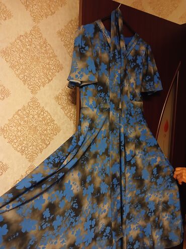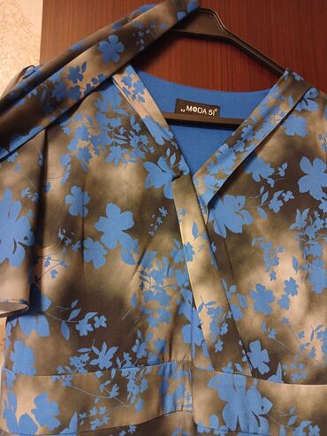 - Parça və rəng: Parlaq, axıcı material; boz-qara fon üzərində mavi çiçəkli naxış