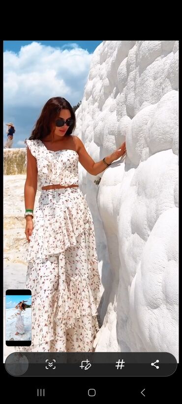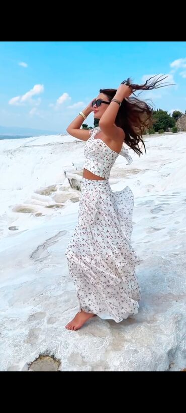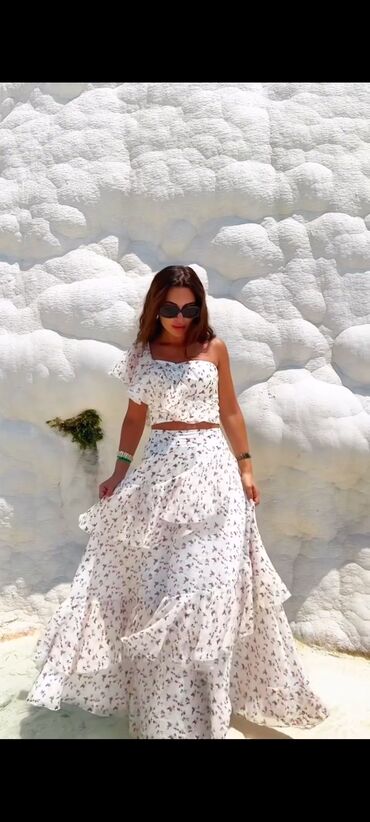 - Komplekt kimi uyğundur: üst və uzun ətək harmonik naxışla tamamlanır
