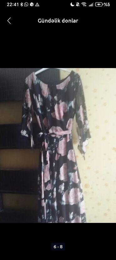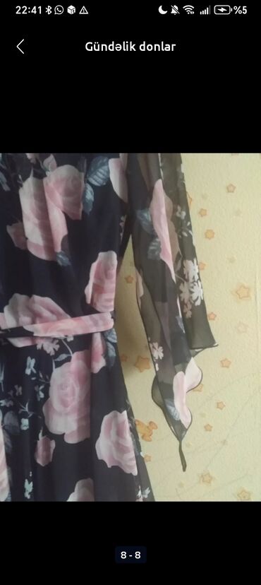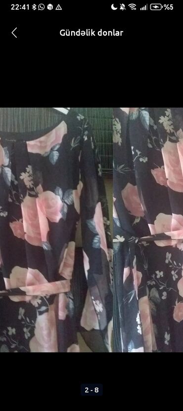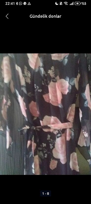 Qadın donu – qara fon üzərində xırda çiçəkli naxış - Model: uzun, axıcı siluetli, A-kəsim - Yaxa: kiçik volantlı/büzgülü yaxa, ön hissədə nazik bağlama kordonu - Qol: uzun qollar - Etek: çoxqatlı ...