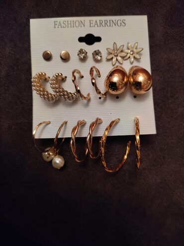 Bir setlə bir neçə görünüş: minimal, klassik, çiçək motivli, incili və iri halqa variantları. Moda aksesuarı olaraq paltarlarla asan uyğunlaşır. Lövhədə “FASHION EARRINGS” qeyd olunur.