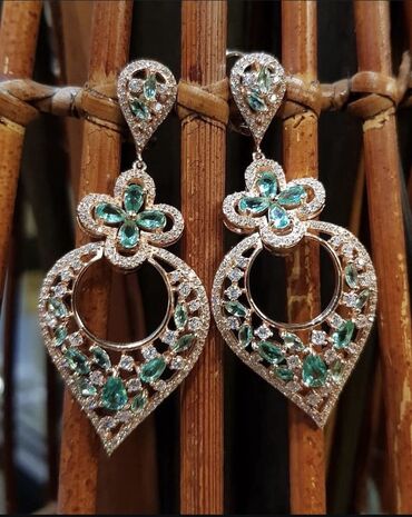 Zərif oyma, sıx pavé işçiliyi və yaşılımtıl daşların kontrastı sayəsində güclü parıltı və diqqət çəkən kompozisiya təqdim edən dekorativ sırğalar.
