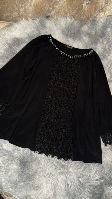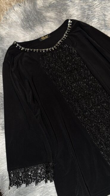 Qara zərif bluz - Rəng: Qara - Parça: İncə şəbəkə/til parça, xırda parıltı detallar ilə - Dizayn: Dairəvi yaxa, 3/4 uzunluqda şəffaf qollar - Aşağı hissə: Ornamenti olan krujeva (qıpqara) ətək kən...