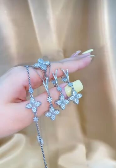 - Dizayn: hər detalda yonca asqı və daşlı xətt elementləri; sırğalarda sallanan yonca asqısı, qulpları klipslidir; boyunbağı və qolbaqda zəncirli quruluş; üzüklə uyğun yonca başlıq.