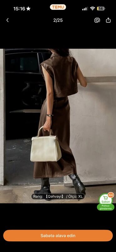 Qadınlar üçün dəst – qəhvəyi rəngdə, dəri effektli midi ətək və qolsuz qısa jilet-köynək kombini.
