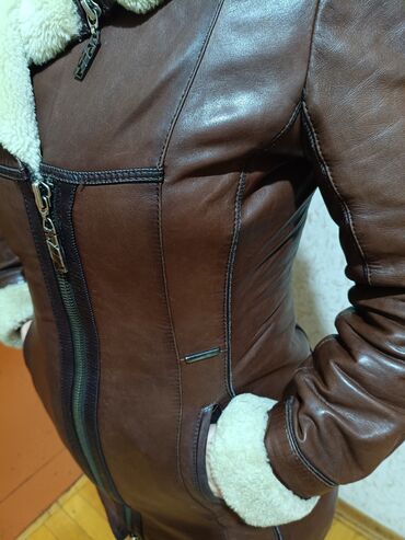 Başlıq: 25 satilir 50 alinib tezedir Təsvir: - Qadınlar üçün qısa “aviator” üslublu dərili gödəkçə - Rəng: qəhvəyi, qara tikiş detalları ilə - İsti süni xəz (şaqqa) astar: yaxalıq, ətək və manjetl...