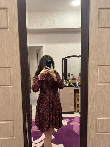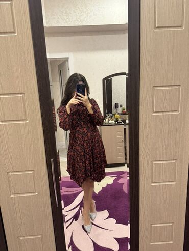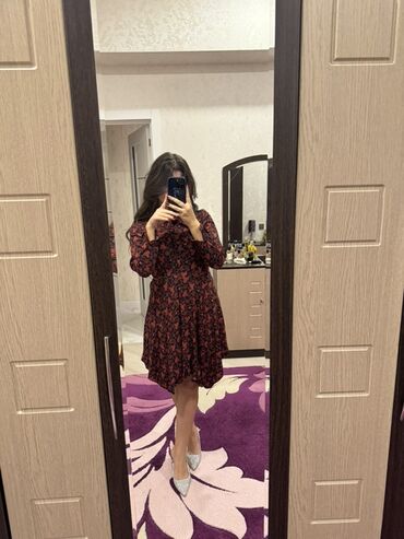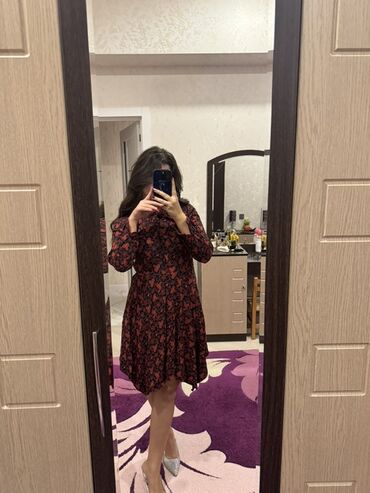Qadın paltarı – qara fon üzərində çiçəkli naxış - Model: bohem üslubunda, sərbəst kəsim - Uzunluq: midi - Yaxa: qapalı büzgülü, bağlama ipləri ilə - Qol: 3/4 uzunluqda, rezinli uclar - Parça: yüng...