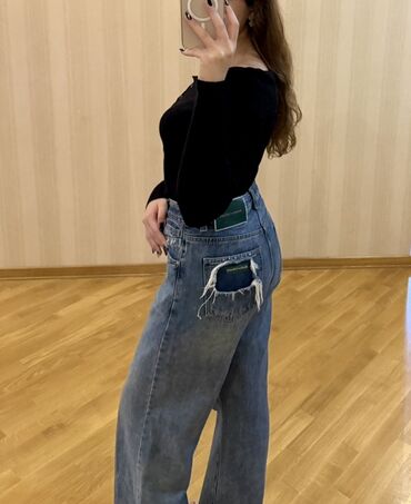 Model: Geniş kəsimli qadın cins şalvar Təsvir: - Yüksək bel, rahat və oversize kəsim - Klassik mavi denim rəngi - Ön hissədə düymə və fermuar bağlanma - 5 ciblə: iki ön, iki arxa böyük kvadrat cib...