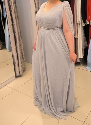 Gümüşü-metallic rəngdə uzun ziyafət geyimi.