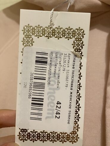 - Detallar: Boyun hissəsində etiket mövcuddur; rəqəmsal barkodlu istehsal etiketində “Платье толстовка женское теплое” qeyd edilib