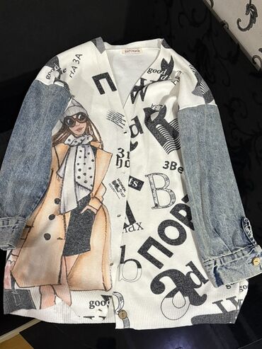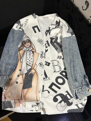 - Rəng/print: ağ fon üzərində qara hərf və yazı motivləri, ön hissədə stilizə olunmuş moda illustrasiyası; qol hissələri denim (cins) materialdan.