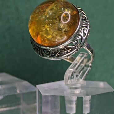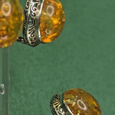 Original tebii kəhrəba daşlarla bəzədilmiş qadın zərgərlik gumus 925 prob dəsti. Dəstə bir üzük və sırğa daxildir, hər birində detallı gümüş naxışlar, şəffaf kəhrəba daşlar var. Kəhrəba daşlarının içərisində kiçik qabarcıqlar və daxilolmalar görünür. Bu dəst zərif və klassik görünüşü tamamlayır.