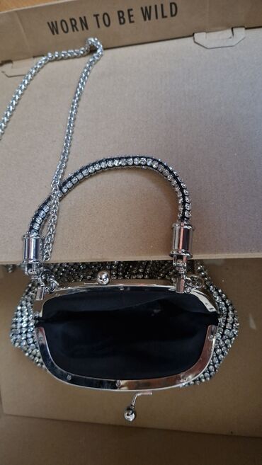 Kristallarla örtülü qısa əl tutacağı.Ayrılabilən uzun metal zənciri çiyində və ya krossover istifadə üçün. karabinlərlə asanlıqla çıxarılır/taxılır. Daxili qara astarlıdır, telefon, açar, pomada və s. üçün kompakt bölmələrə ayrılıb.Ölçü 20 sm en.