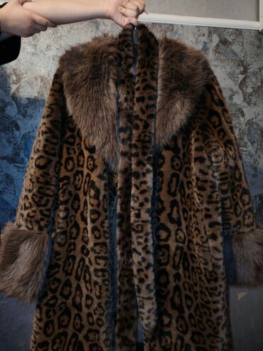 - Material görüntüsü: Qəhvəyi-qara leopar printli yumşaq xəz; ön hissə, yaxa və manjetlərdə daha uzun, həcmli tünd-qəhvəyi xəz detalları