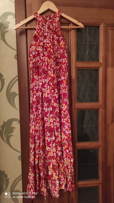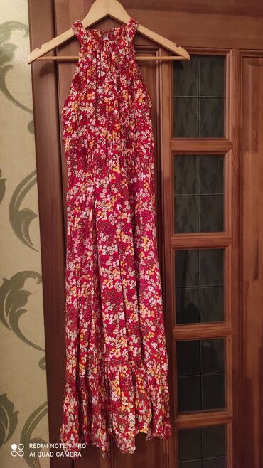 Qırmızı rəngli, xırda çiçək naxışlı uzun yay donu.