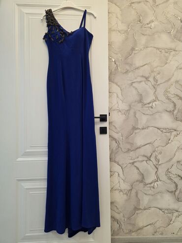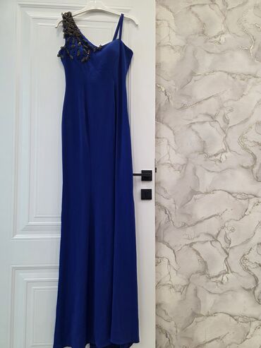 Məhsul: Zərif axşam/gecə paltarı - Rəng: Kobalt mavi - Model: Bir çiyinli dizayn, sağ tərəfdən incə tək askı ilə - Uzunluq: Tam uzun maxi - Bəzək: Çiyin və sinə hissəsində qara/qızılı tonlarda bon...