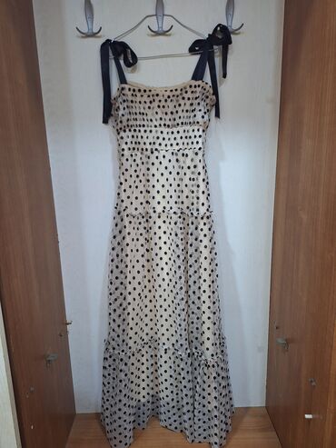 - Material: iç hissəsi açıq rəngli parça, üstündə şəffaf xallı tül qat; ətək hissəsi qat-qat büzgülü