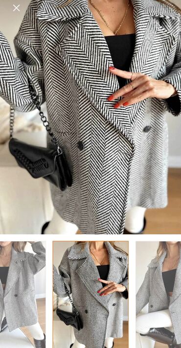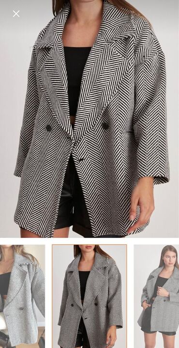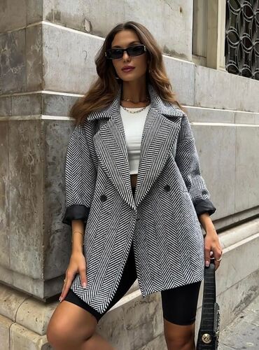 Qadınlar üçün oversize palto – qara-ağ ziqzaq/ox ucluğu (herringbone) naxışlı.