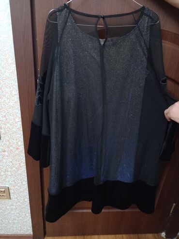 Qara rəngli, parıltılı parçadan geniş kəsimli qadın bluz/tunika.