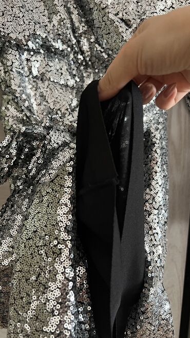 IParıltılı qara ziyafət geyimi - Model: Dizdən aşağı uzunluqda, düz kəsim - Material: Bütövlükdə payetlərlə örtülmüş parça; alt qat incə elastik astar - Rəng: Qara, güclü parıltı effekti - Yaxa: Ü...