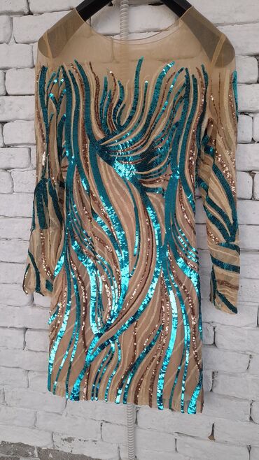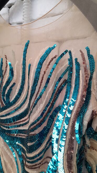 Krem rəngli, bədənə oturan ziyafət/libas - Model: korset tipli, çiyindən açıq (strapless) - Büst hissəsi dərin V-kəsimli, parlaq daş/boncuk haşiyə ilə bəzədilib - Parça: incə payetlərlə tam örtülü...