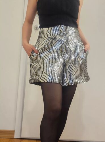 ZARA qadın şortik - Model: yüksək belli, “paperbag” kəsimli şort - Material: qara eko‑dəri (parlaq effektli) - Ölçü: EU M / USA M / MEX 28 (etiketdə göstərilib) - Dizayn: ön hissədə uzun, eyni mat...