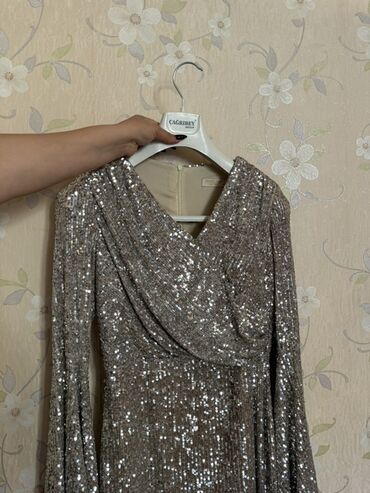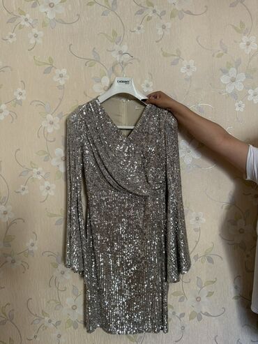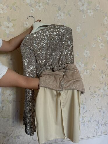 46 razmer.Zərif ziyafət geyimi - Rəng: şampan/bej əsas, üzərində gümüşü parıltılı payet naxışlar. - Kəsim: diz üstü/orta uzunluq, bədənə oturan siluet - Dekor: diaqonal payet zolaqları, sağ tərəfd...