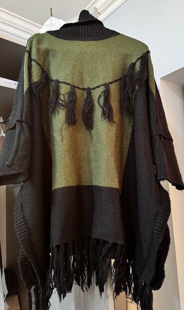 Qadın trikotaj sviteri - Rəng: boz/torpaq tonları - Model: yumru yaxalı, rahat kəsim - Yaxa hissəsində bərq vuran daşlı dekor - Ön hissə və qollar boyunca toxuma naxışları; çiyinlərdə hörmə detall...