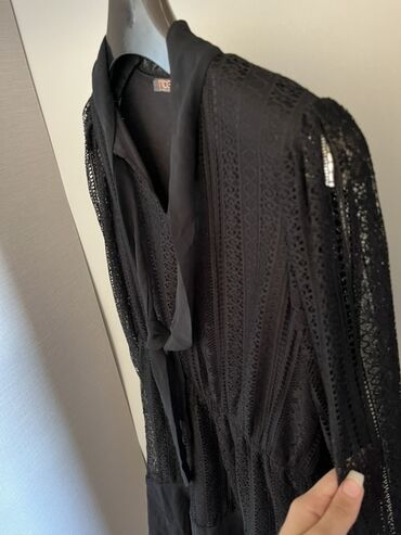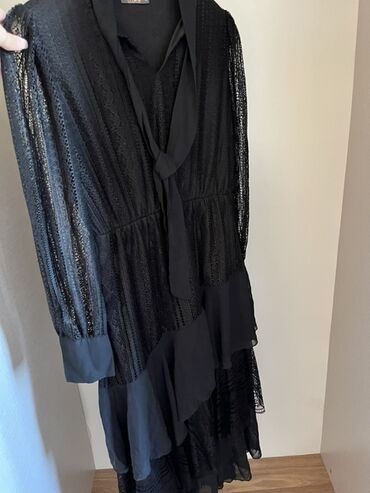 Qara rəngdə çoxqatlı maksi don, zərif naxışlı şifon detalları . Donun həm yaxasında, həm də bel hissəsində lent bəzəyi var. 1 defe geyinilib