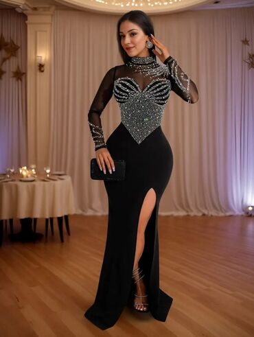 Qara rəngdə zərif uzun ziyafət geyimi - Üst hissə: parlaq daşlarla bəzədilmiş, ürək formalı kəsim effekti verən büst; üstündə şəffaf tül kürək və çiyin hissələri. - Bel xətti incə vurğulanıb, kiçi...
